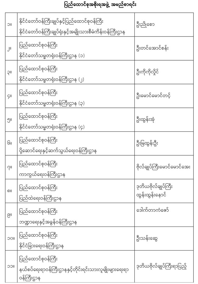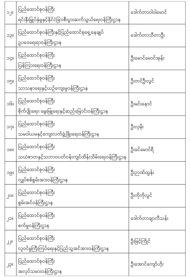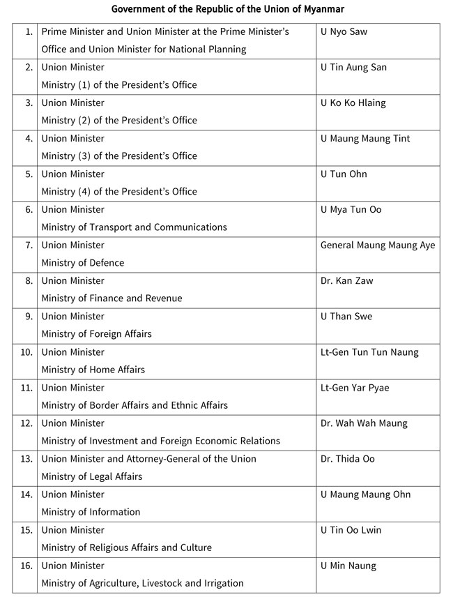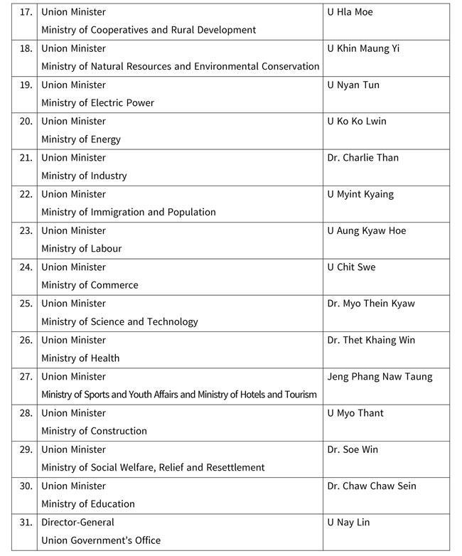 ပြည်ထောင်စုသမ္မတမြန်မာနိုင်ငံတော်၊ ပြည်ထောင်စုအစိုးရအဖွဲ့ Useful Websites Myanmar Embassy Websites Australia Belgium Belgrade Brunei Darussalam Canada Egypt India Kuwait Kunming (China) Kuala Lumpur Nanning Phnompenh South Korea Saudi Arabia Switzerland Singapore New York Government Websites Myanmar Ministry Websites President office (Myanmar) Pyithu Hluttaw Ministry of information Ministry of Trade and e-comm Ministry of Industry 1 Ministry of Industry 2 Ministry of Foreign Affairs Ministry of National Planning and Economic Development Ministry of Commerce Ministry of Livestock-Fisheries Ministry of Construction Ministry of Co-Operatives Ministry of Hotels and Tourism Ministry of Home Affairs Ministry of Education Ministry of Health Myanma Posts and Telecommunications(MPT) Ministry of Social welfare, Relief and Resettlement (Department of Social Welfare) Ministry of Science and Technology Ministry of Labour Ministry of Energy Ministry of Forest and Environ Mon Government Ministry of Rail Transportation The Ministry Of Religious Affairs Union Civil Service Board Yangon City Development Committee UNITED NATIONS WEBSITES http://www.un.org https://unog.ch/
